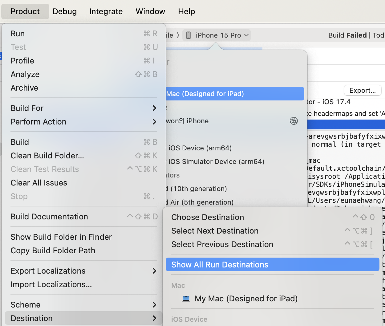 드디어 빌드가 되는구나 싶은데 Simulator device failed to install the application 팝업이 뜹니다.