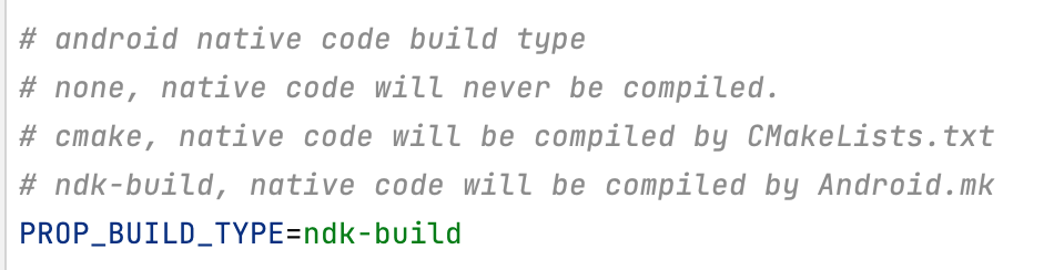 ndk-build로 진행할 거라 gradle.properties 에서 build type을 ndk-build로 바꿔줍니다.