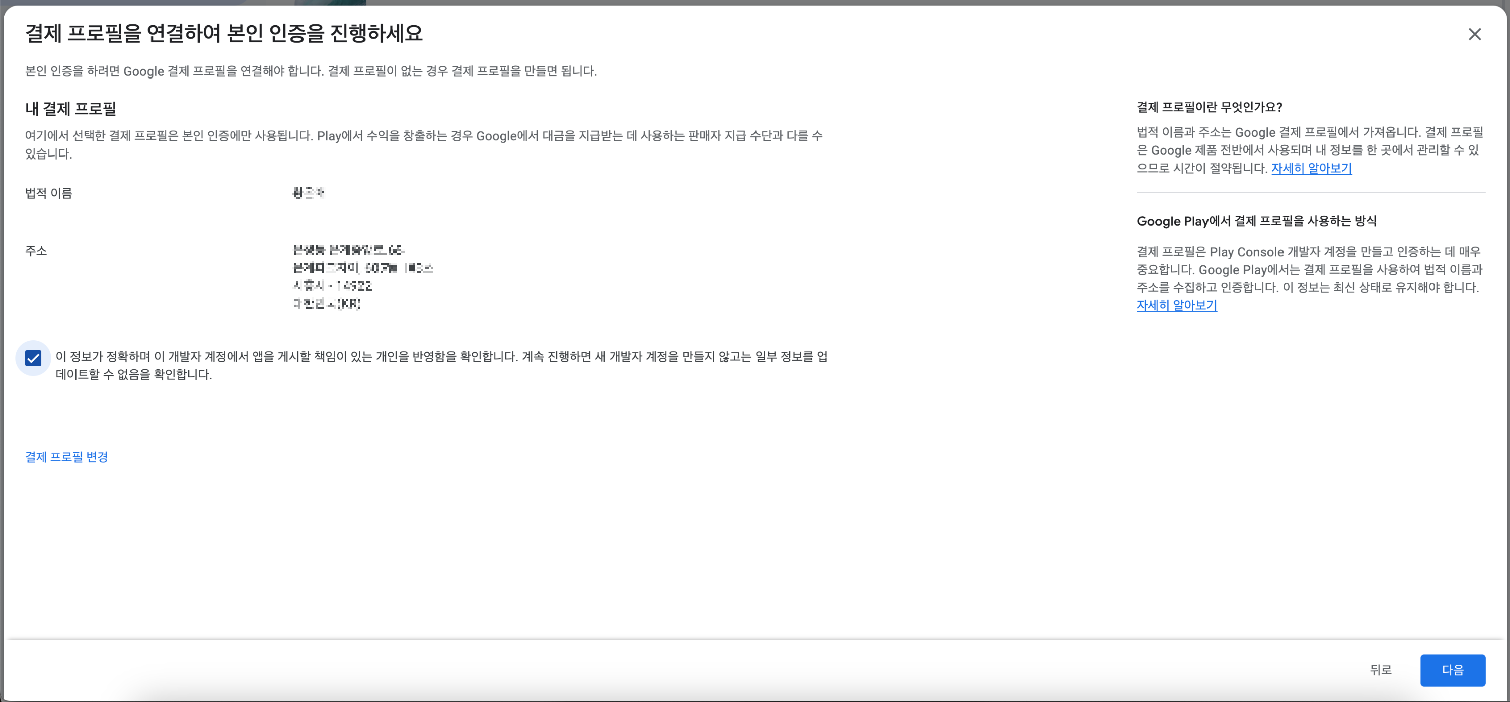 계정 유형 확인 > 결제 프로필 연결 > 계정 정보 제공 > 공개 및 비공개 세부정보 제공