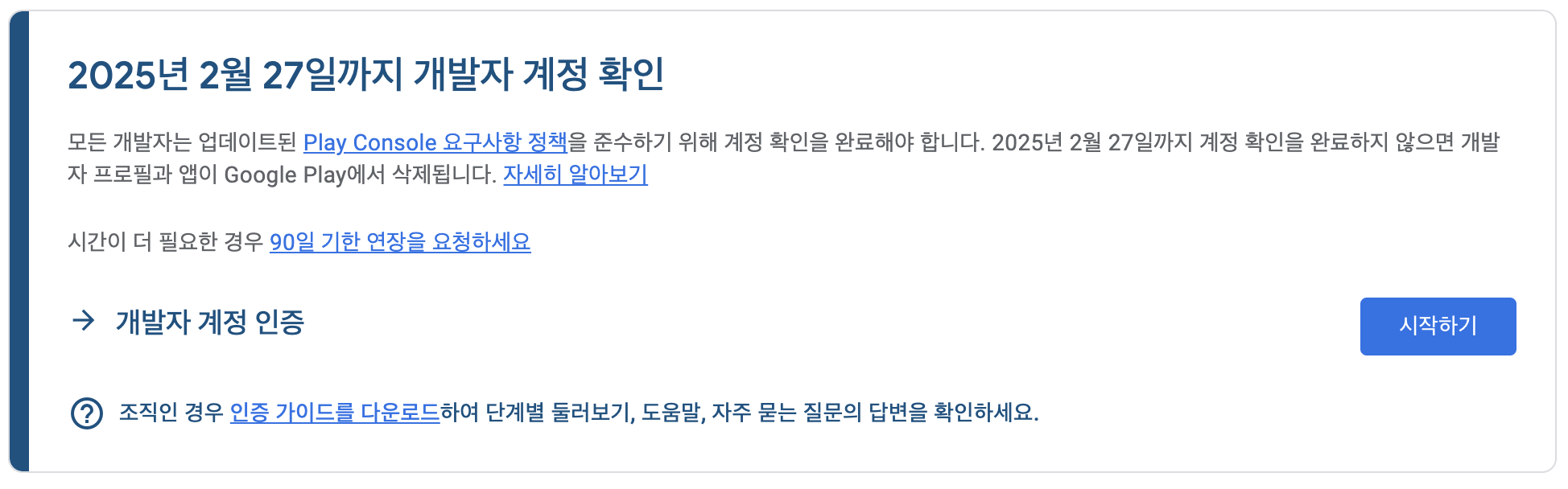 모든 개발자는 업데이트된 Play Console 요구사항 정책을 준수하기 위해 계정 확인을 완료해야 합니다.