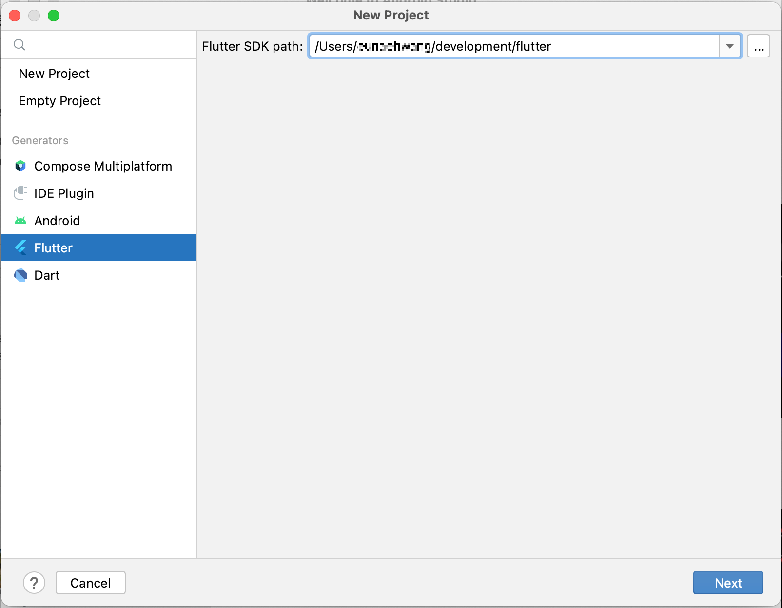 Welcome to Android Studio 팝업 > New Flutter Project