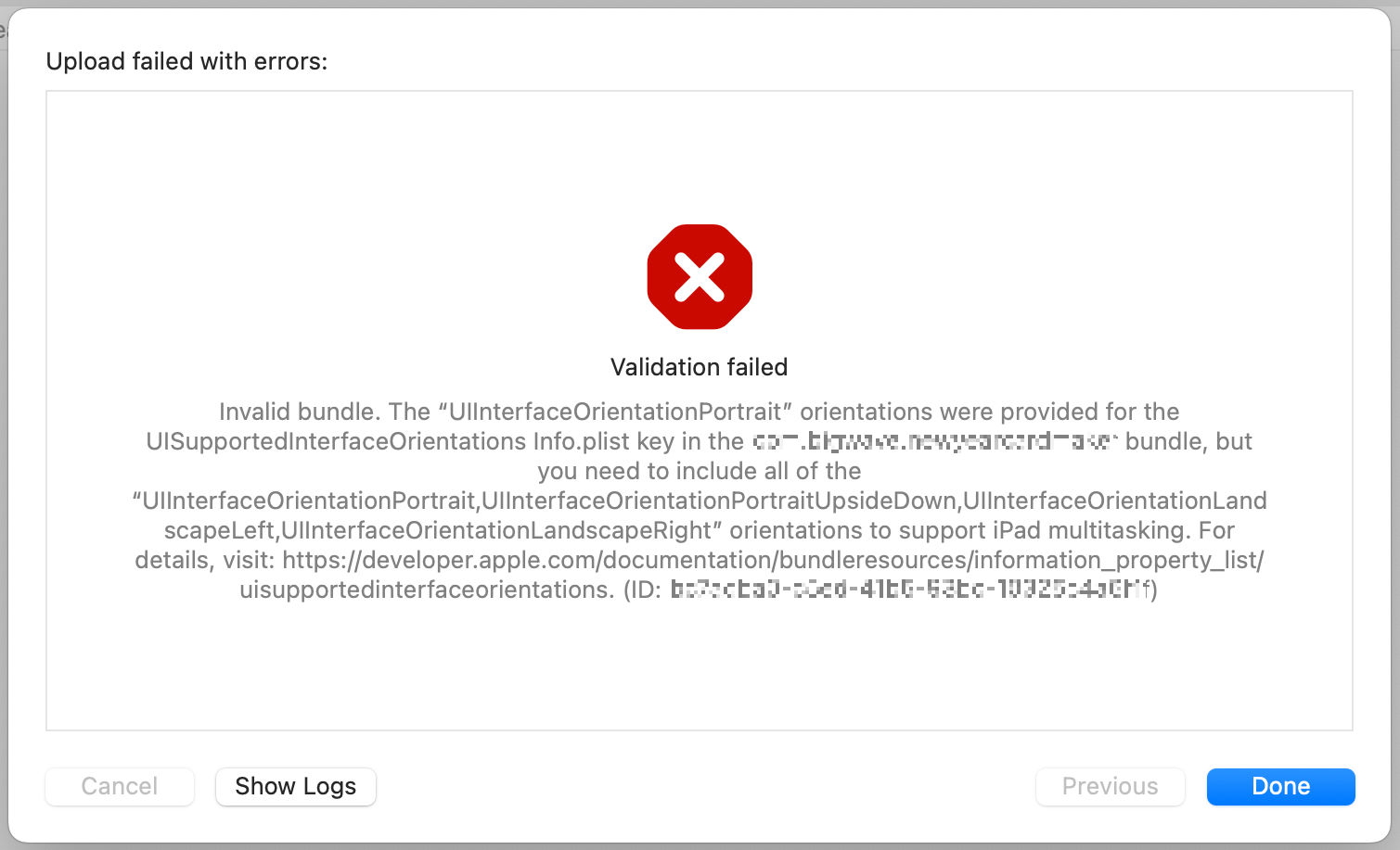 Invalid bundle. The 'UIInterfaceOrientationPortrait' orientations were provided for the